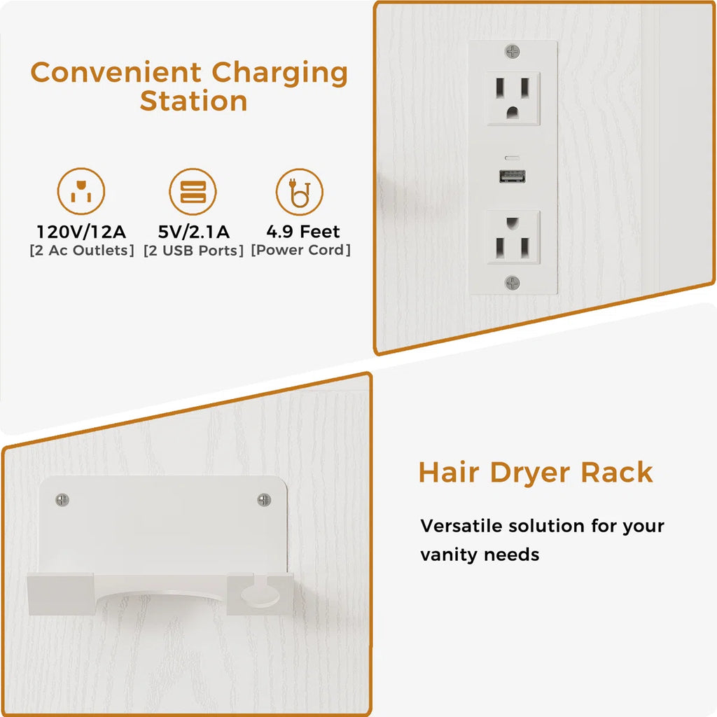 Vanity Desk with Charging Station – Features a built-in power strip with 2 outlets and 2 USB ports, perfect for charging your devices or powering beauty tools conveniently at your vanity.