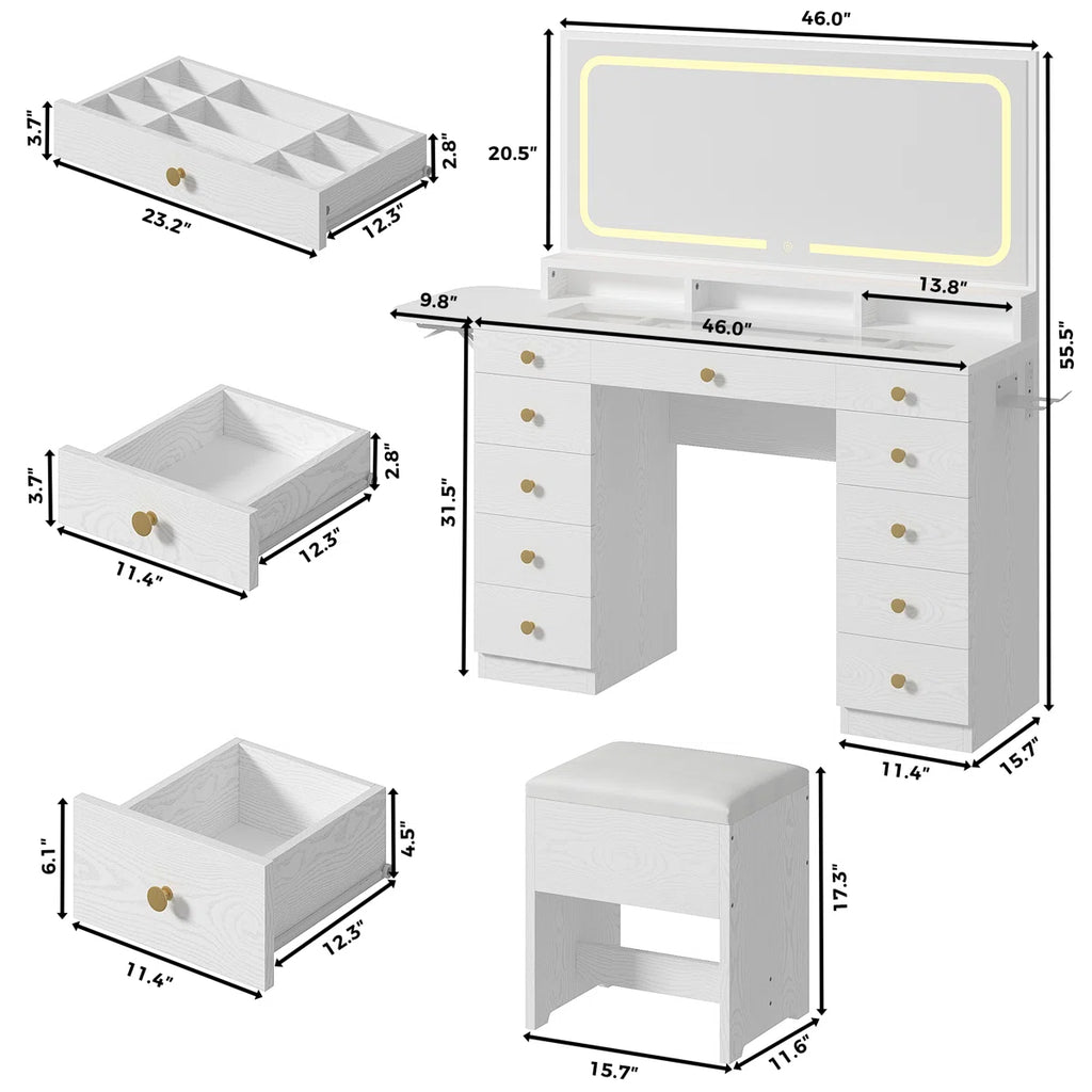 Transform your bedroom into a luxurious retreat with this 46" Large 11-Drawer Vanity Set. The set includes a beautifully designed makeup table with a mirror, LED lights, a built-in hair dryer rack, a convenient power outlet, and a foldable, extendable tabletop. It also comes with a faux leather upholstered stool featuring hidden under-seat storage, making it an essential addition to your daily beauty routine.