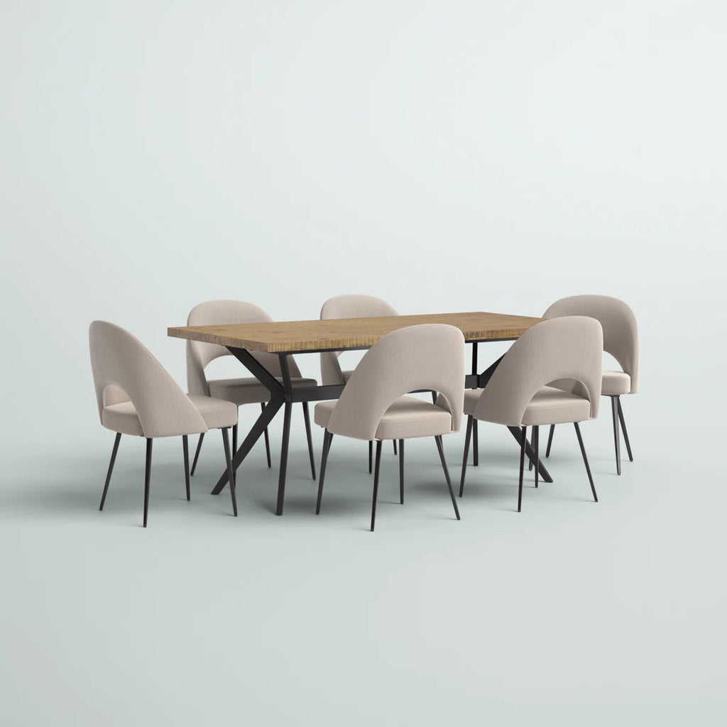 This 7-piece dining set combines an eclectic mix of materials with architectural silhouettes, creating a modern and cohesive dining space. The set includes one table and six chairs, each crafted with a sturdy metal frame for lasting durability.