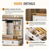 This multifunctional vanity table blends modern design with everyday practicality, making it the perfect upgrade for any bedroom. The LED mirror light with three modes (blue, warm, white) ensures flawless makeup application in any setting. With multiple drawers, open compartments, and an adjustable side cabinet, it offers versatile storage for cosmetics and essentials while maximizing room space. The added USB and wireless charging functions keep your devices powered and ready, making your daily routine effortless and organized.