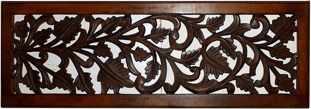 Mango Wood Wall Panel Hand Crafted with Leaves and Scroll Work Motif, Rectangle, Brown