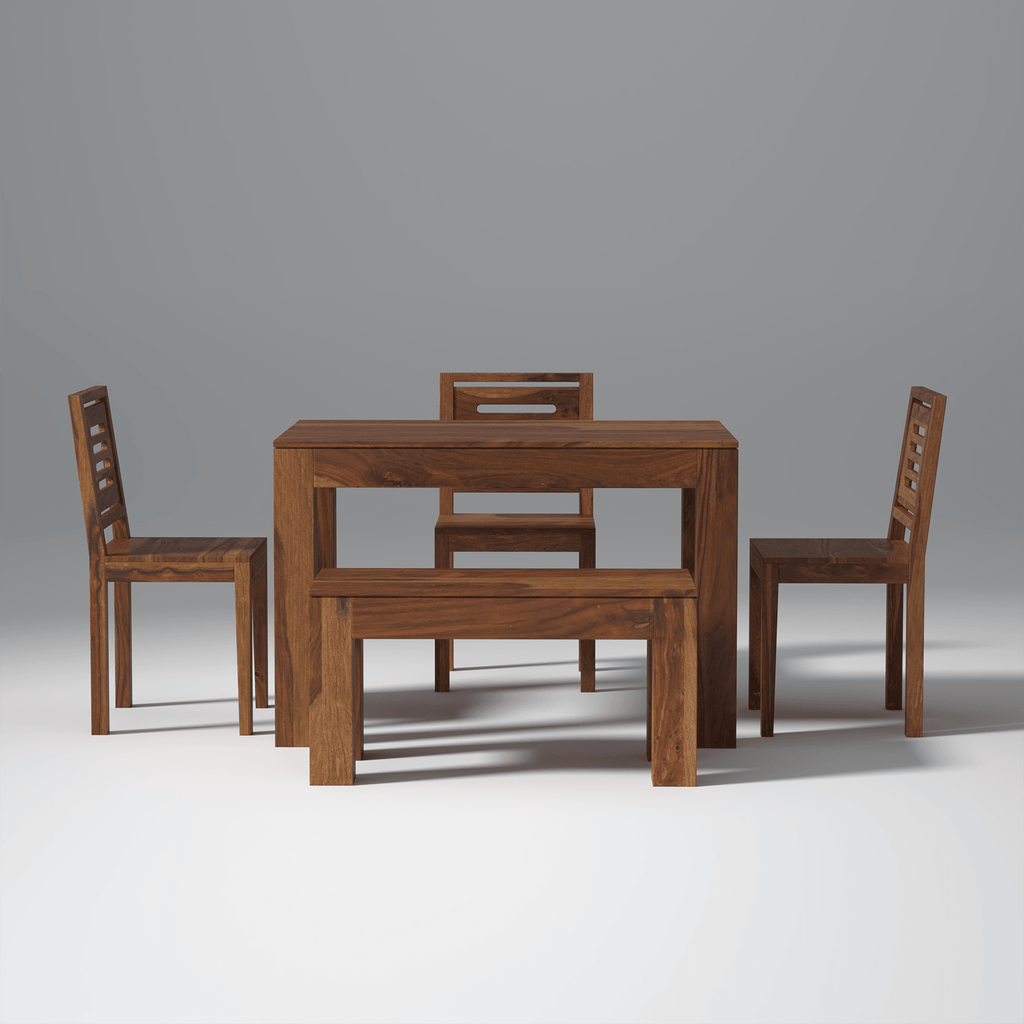 Elevate your dining experience with the Mauro Dining Set, a perfect blend of craftsmanship and style. Exquisitely crafted from premium Sheesham wood, this set features a captivating light honey finish that brings out the rich natural beauty and texture of the wood. The set includes a sturdy dining table, three ergonomically designed chairs, and a versatile bench, providing ample seating and a welcoming atmosphere for family gatherings or dinner parties. The elegant light honey finish enhances the inherent beauty of Sheesham wood, adding warmth and sophistication to any dining room or living space. With its timeless appeal, durable construction, and functional design, the Mauro Dining Set offers a perfect combination of style and practicality, ensuring lasting quality and memorable dining experiences for years to come.