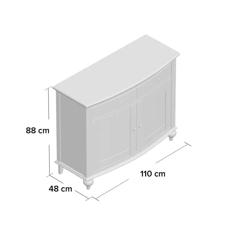 This sideboard is brimming with traditional charm, featuring a serpentine framed top, bow-fronted cabinets, and classically styled turned legs. Expertly crafted from solid wood, this piece is built to stand the test of time. It offers ample storage with two drawers and a spacious cabinet, making it perfect for storing crockery, media equipment, games, electronics, and more. Its timeless design is sure to complement any dining room setting.