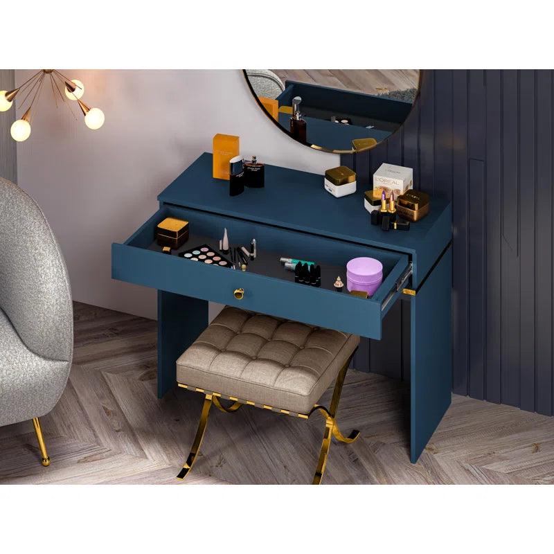 The Raab 09 dressing table will work well in your bedroom. The large tabletop will allow you to display your perfume collection and store your make-up products. If you like minimalist tidiness, you can store all your cosmetics in a capacious drawer, and the top will serve as a place to place a vase with your favourite flowers, for example. All of the furniture in the Raab collection features a deep dark blue décor.