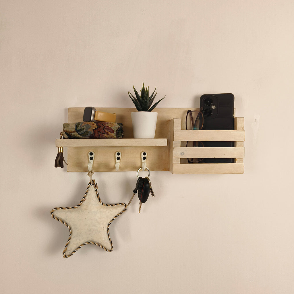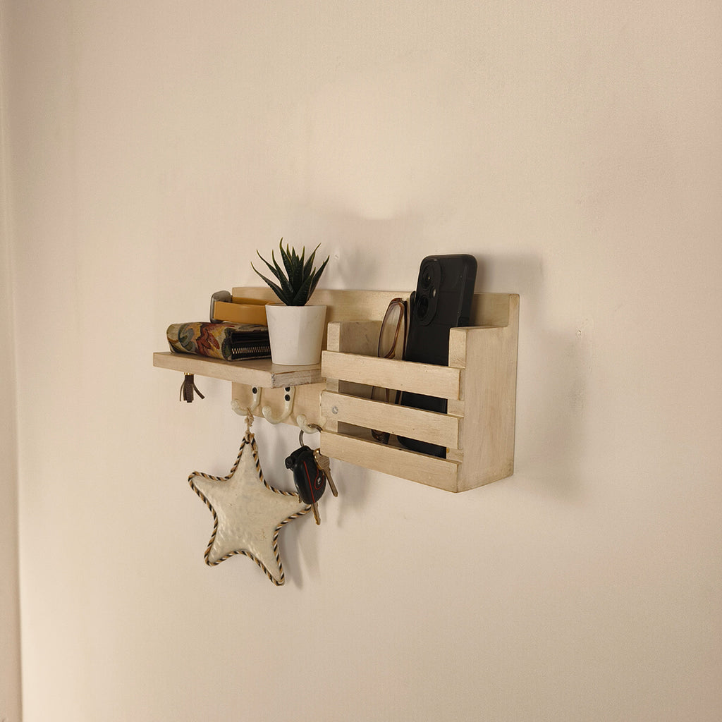Add style and functionality to your home with the TULIP Wooden Wall Shelf Organiser with Key Holders. Made from high-quality wood, this elegant wall décor piece offers a practical space to hang keys, store essentials, and display decorative items, keeping your entryway, hallway, or living area organized and charming.